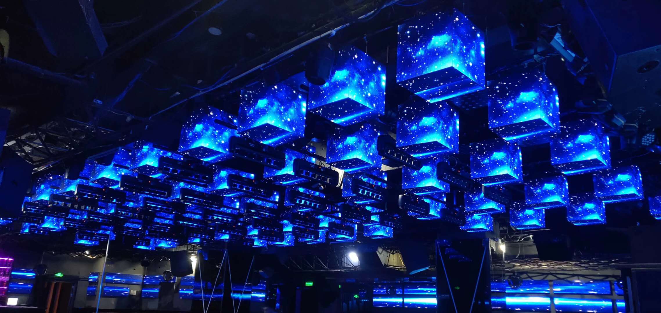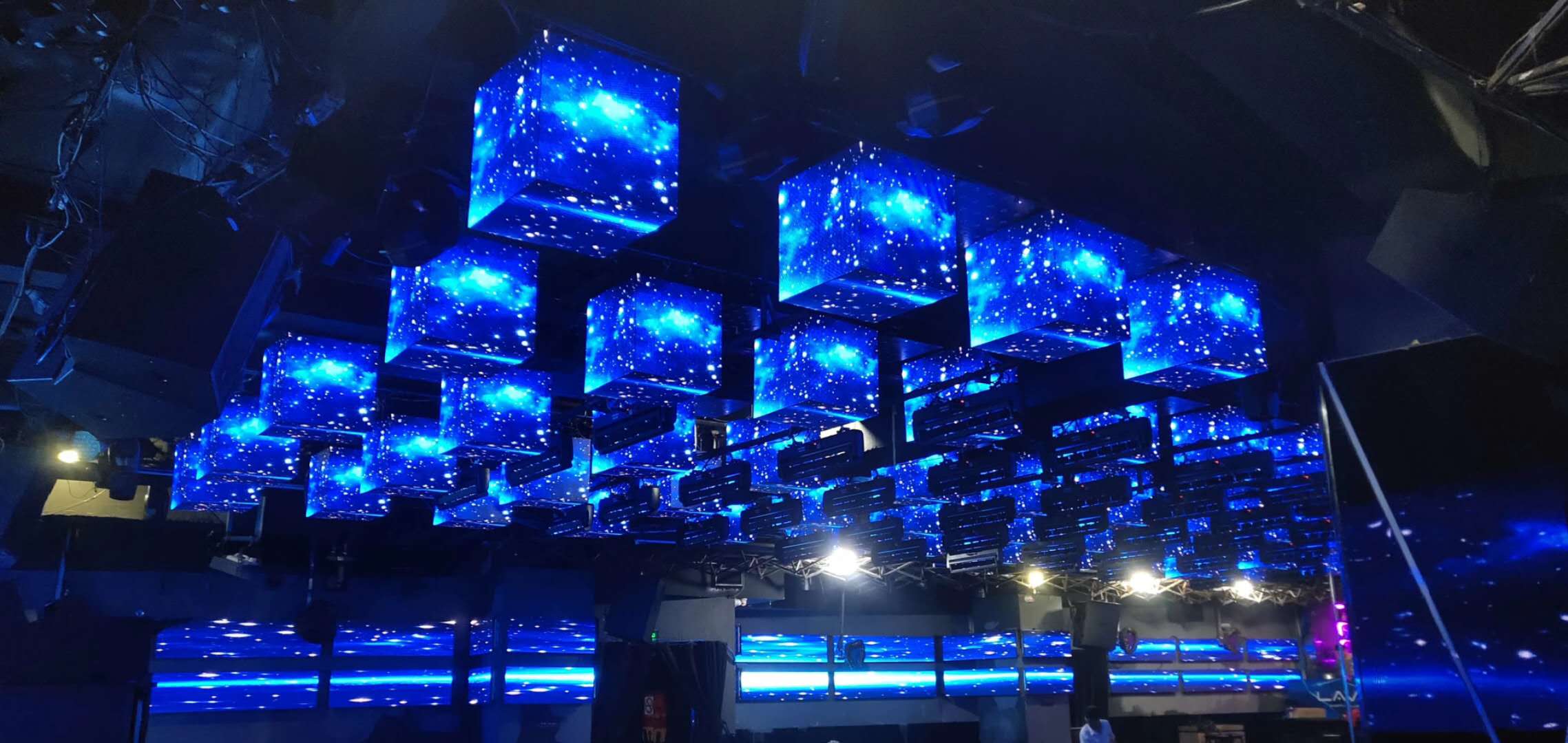 酒吧LED电子大屏迎来了一波建设高潮!由于LED酒吧大屏的高性价比互动性,使得越来越多的酒吧业主选择了室内P4酒吧大屏。广州潮流酒吧的领头羊,风格自然是不能逊色。该酒吧在结合了甲方设计师和我公司的专业的工程师的综合建议,在市场调查了众多潮流酒吧以后,酒吧电子大屏天幕采取了水晶柱式方形造型,矩阵式摆放,让整个酒吧变得非常哥特又不失特色,在蓝色调的素材衬托下,给观众惊艳的感觉。酒吧主屏采取了大屏加两块副屏结合,让现场的舞池游客最大范围内感受到LED酒吧显示屏的魅力,结合LED足球异形屏,将酒吧的氛围迸发到最高点!